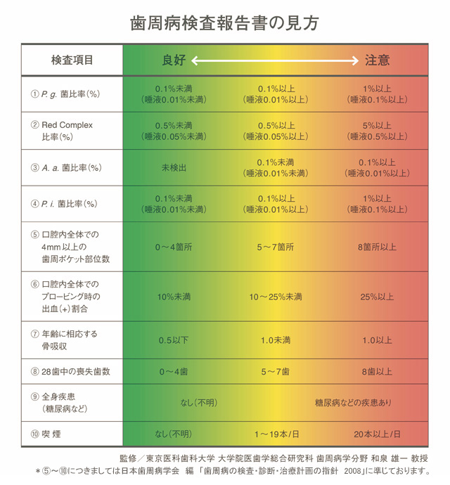 検査値の指標に関しましては現在、歯科検査、特に歯周病疾患に関する検査はエビデンス確立の為に大学等研究機関が基準値となるデータを収集中でございます。