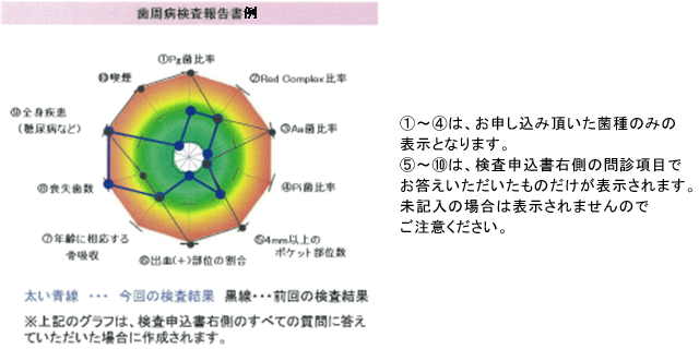 また、Red ComplexについてはP. gingivalis、 T. denticola、T. forsythiaの全てのお申し込みがないと検査報告書に表示されませんので、ご注意ください。